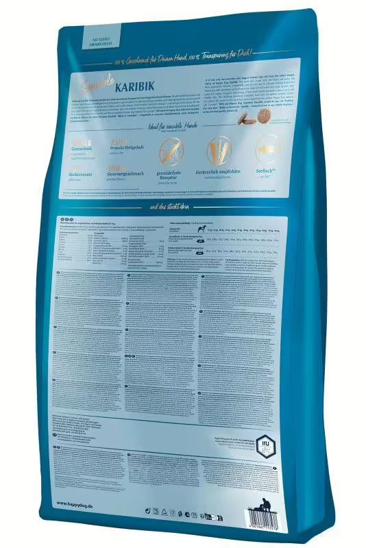 L'alimento completo super premium Happy Dog Karibik, straordinariamente gustoso, è ideale per tutti i buongustai adulti a partire da 11 kg che cercano la varietà o sono molto esigenti.