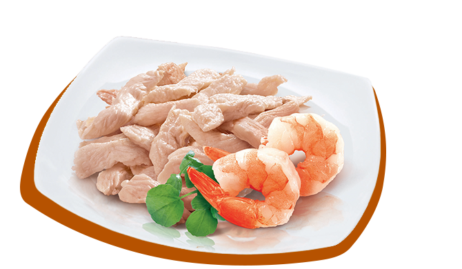 Teneri sfilaccetti di pollo uniti a gustosi gamberetti, cotti al vapore in acqua di cottura.