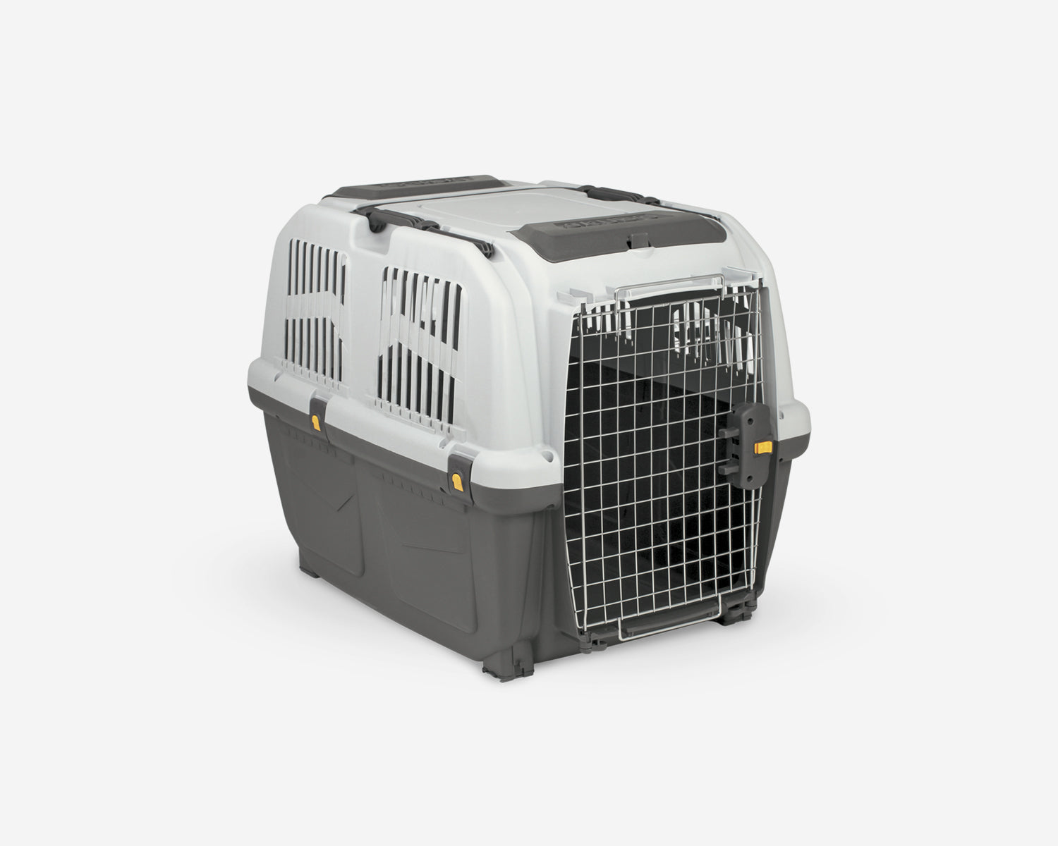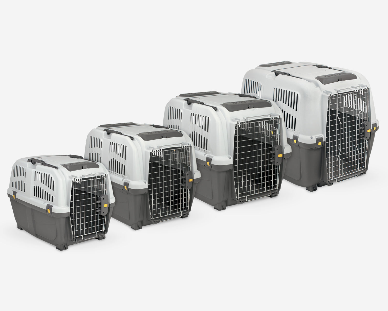 Trasportini per cani di media e grossa taglia, conformi agli standard per il trasporto aereo. Completi di porta in metallo con chiusura di sicurezza a doppio comando, vano porta documenti/oggetti e un maniglione girevole per la versione trolley.Set ruote disponibile come accessorio.